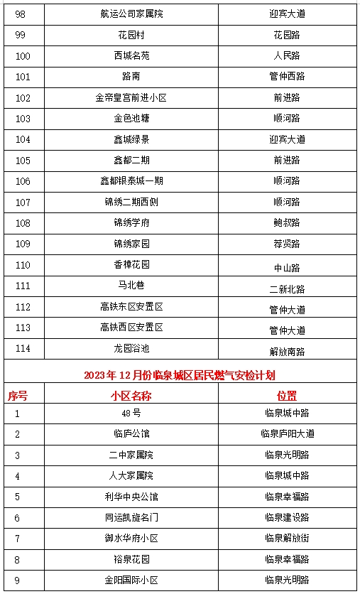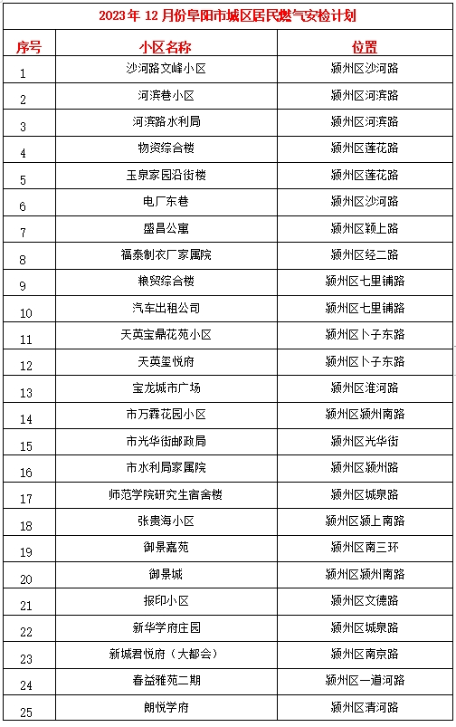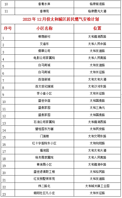 為了保障您的生命財產(chǎn)安全,燃?xì)庠O(shè)施的運(yùn)行安全及正常供氣。我公司將于12月份擬對下列小區(qū)進(jìn)行燃?xì)馊霊舭踩珯z查,請廣大燃?xì)庥脩舴e極配合并相互轉(zhuǎn)告。