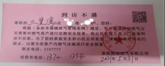 當(dāng)您回到家中,發(fā)現(xiàn)您的家門口有一張到訪不遇的貼紙時(下圖),那是根據(jù)《阜陽城鎮(zhèn)燃?xì)夤芾項l例》規(guī)定,安檢員到您家中定期檢查,到訪后您家中無人,請您回家后及時和我司聯(lián)系,或者因特殊原因錯過安檢,您可以預(yù)約安檢時間,為了保證安全用氣,請及時與我公司安檢人員聯(lián)系。