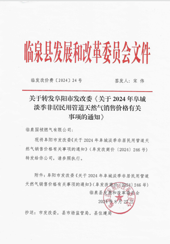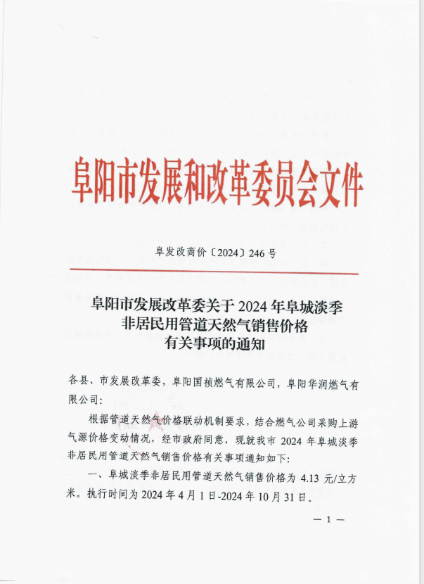 關(guān)于轉(zhuǎn)發(fā)阜陽市發(fā)改委《關(guān)于2024年阜城淡季非居民用管道天然氣銷售價(jià)格有關(guān) 事項(xiàng)的通知》