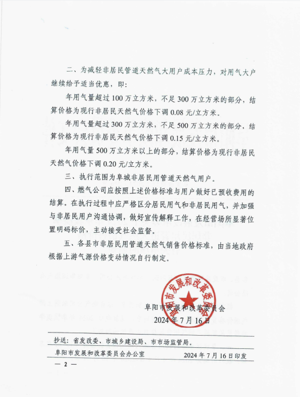 阜陽市發(fā)改委關(guān)于2024年阜城淡季非居民用管道天然氣銷售價(jià)格有關(guān)事項(xiàng)的通知