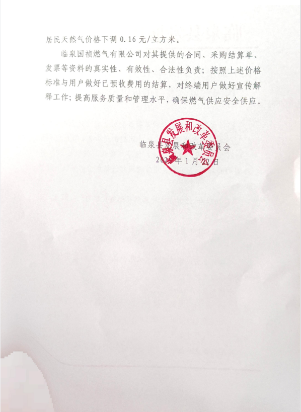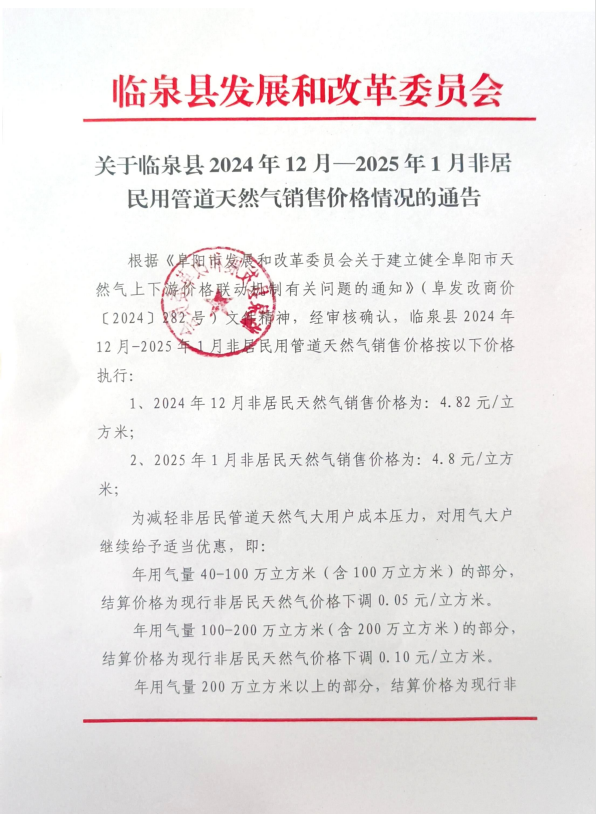 關(guān)于臨泉縣2024年12月-2025年1月非居民用管道天然氣銷售價(jià)格情況的通告