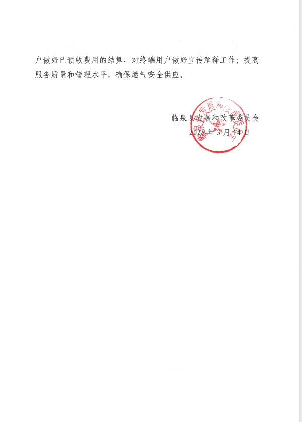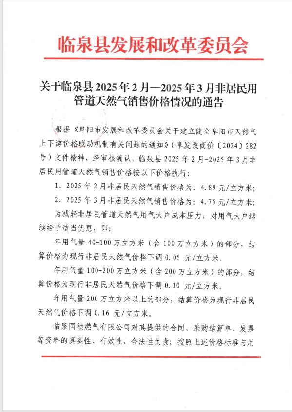 關(guān)于臨泉縣2025年2月-2025年3月非居民用管道天然氣銷售價格情況的通告