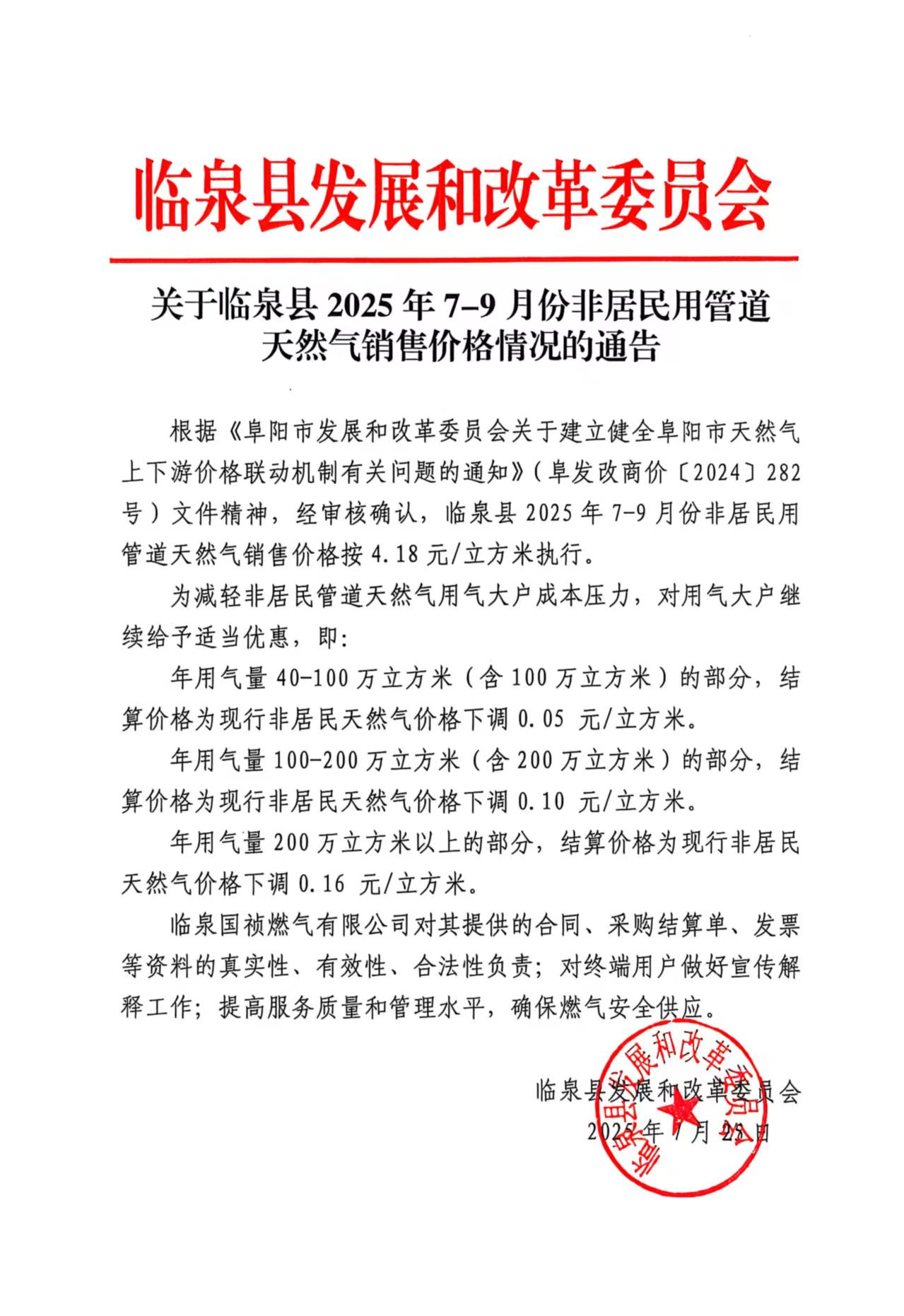 關(guān)于臨泉縣2025年7-9月份非居民用管道天然氣銷(xiāo)售價(jià)格情況的通告
